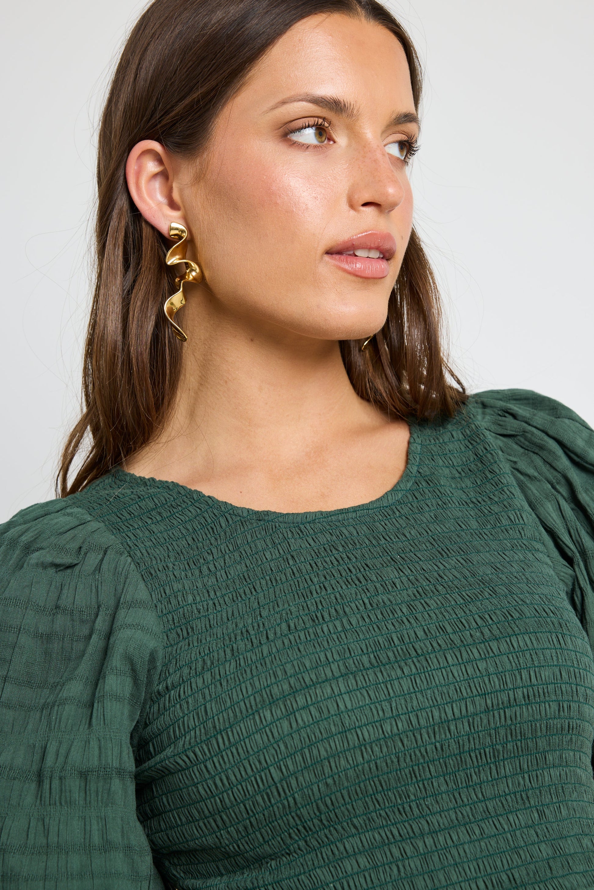 - Statement puff sleeves to balance and contrast the slimline body